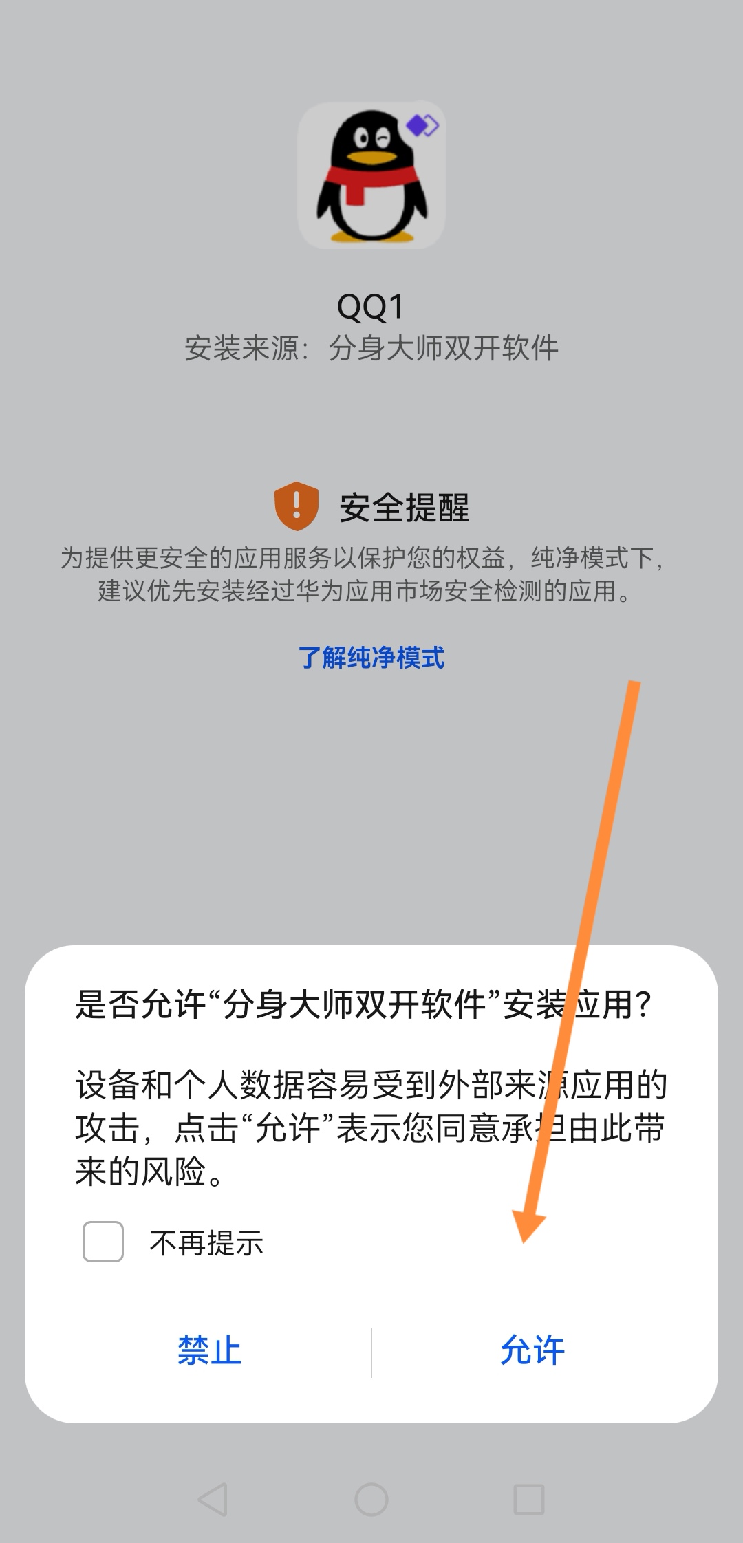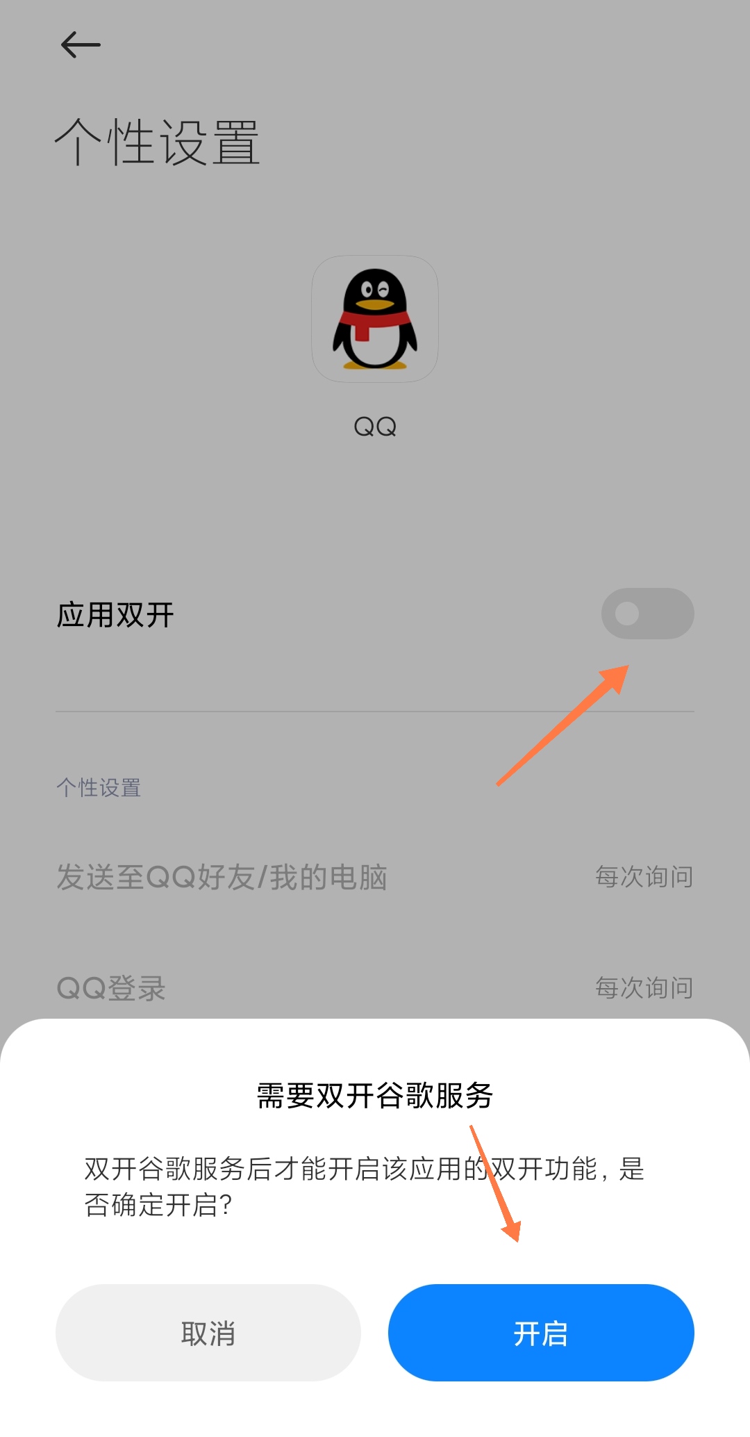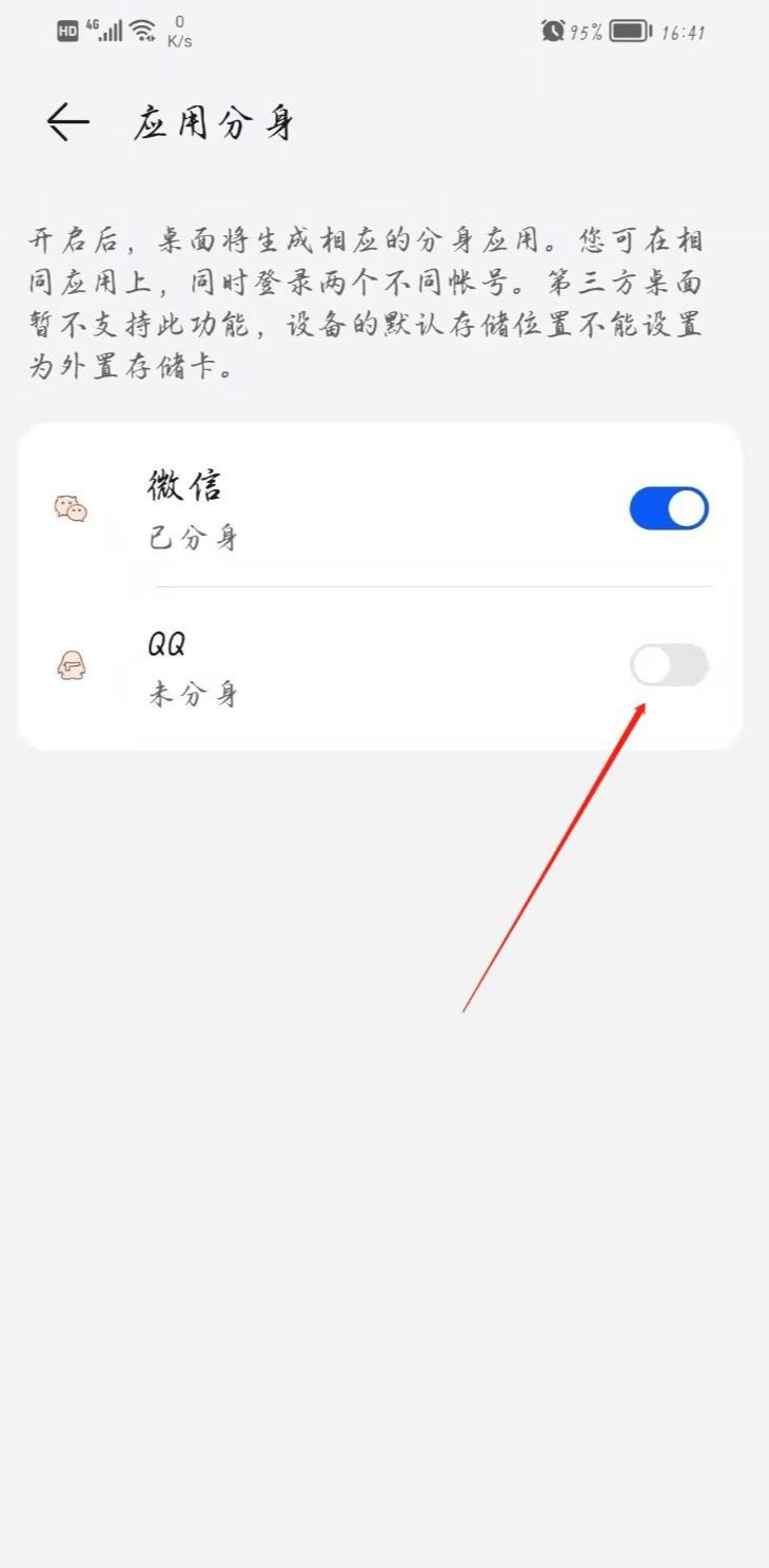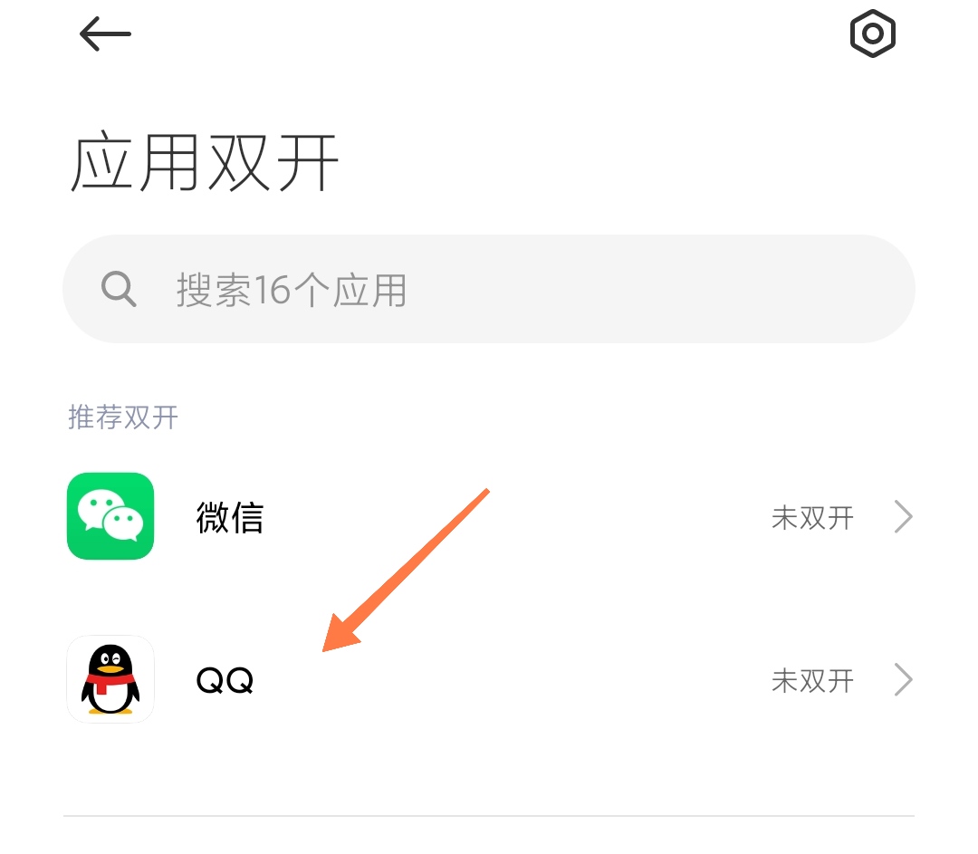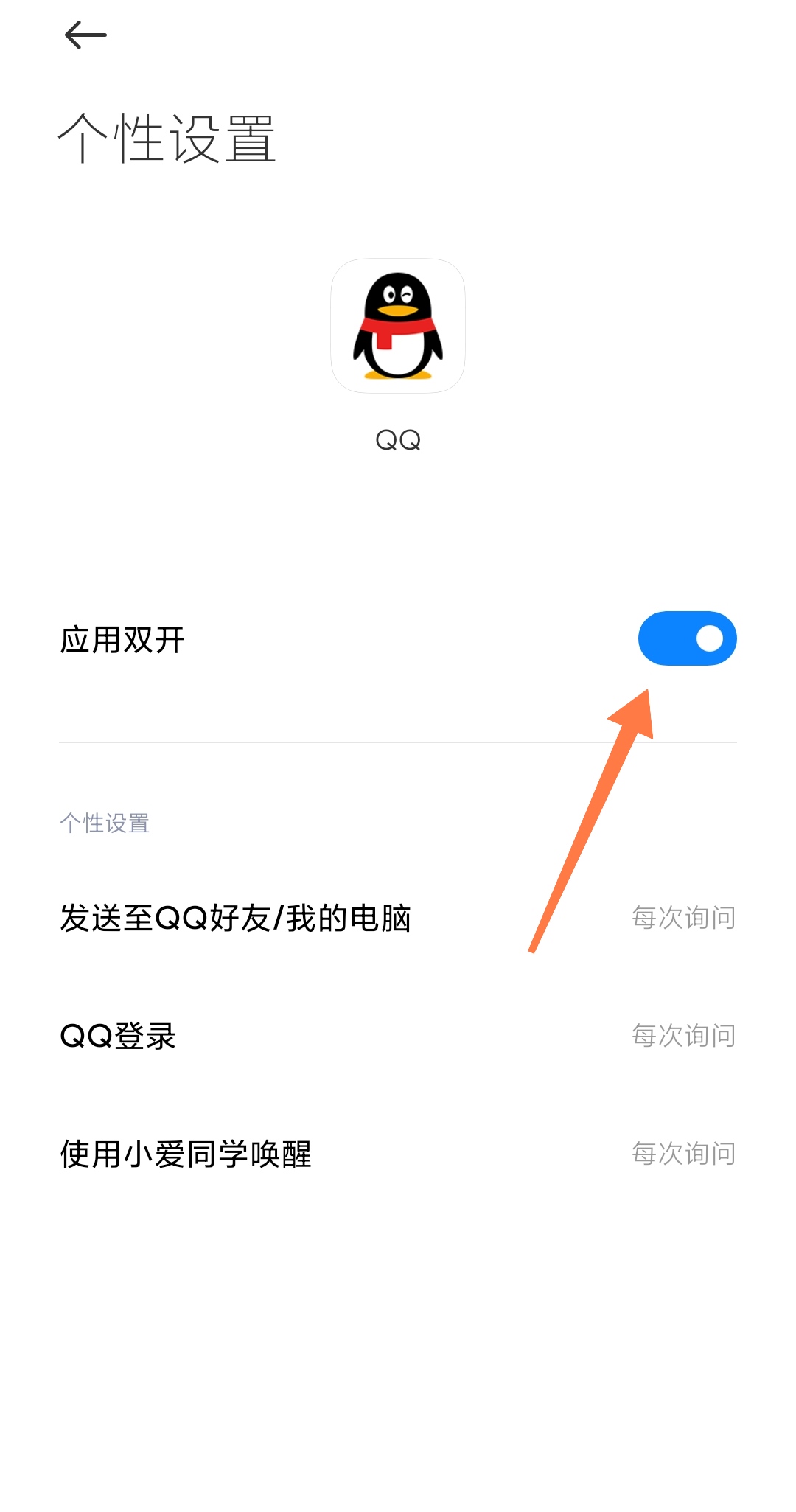 2、打开应用双开设置后,在这里把QQ的开关打开。这样我们的QQ就可以进行双开了。