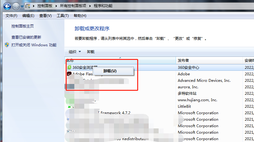4进入程序和功能页面后,找到360浏览器,单击鼠标右键,出现菜单后,点击卸载图标