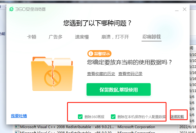 5、 接着,在当前安装的程序中,你先把360安全卫士和360杀毒软件卸载掉(选择我要直接卸载360安全卫士),然后卸载360浏览器并勾选“同时删除个人配置数据及收藏”,点击继续